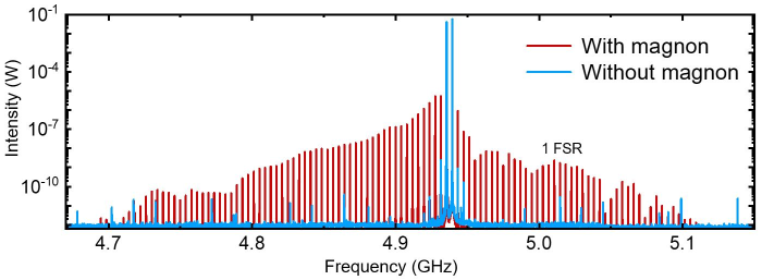 记者了解到,得益于显著的非线性效应,研究团队首次成功激发了磁子-声子混合频率梳,并利用外部注入参考微波实现了克尔诱导的频率梳同步现象,最终生成的频率梳带宽超过400MHz,对应的梳齿数目超过130根。这项研究成果为集成磁振子学器件的发展奠定了基础,该器件在片上信号处理和超灵敏检测方面具有巨大的应用潜力,开辟了非线性混合磁振子学研究的新前沿。